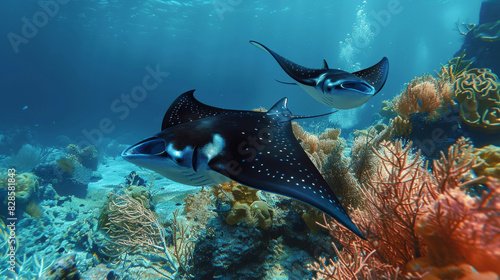 Graceful manta rays gliding over coral reefs in clear turquoise waters
