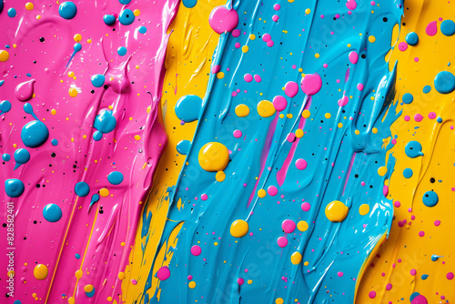 Vibrant pink, blue, and yellow paint splatter on a colorful background