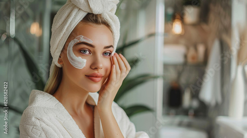 Woman applying moisturizer on face in bathroom for skincare routine