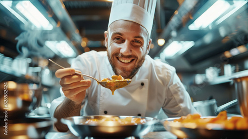 Professional chef in a commercial kitchen expertly presenting a gourmet dish