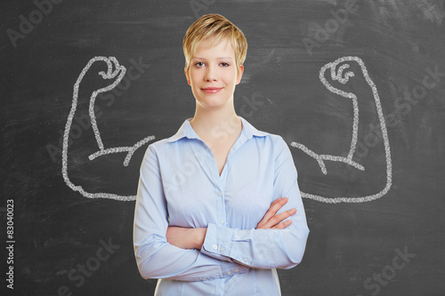 Erfolgreiche Frau mit aufgemalten Muskeln