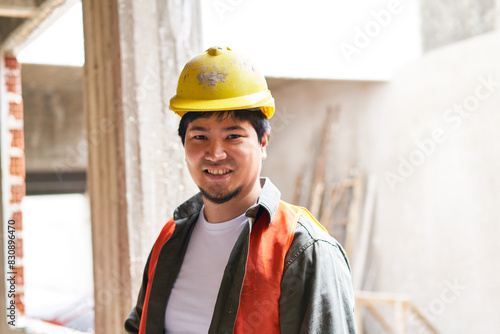Portrait of smiling young male bricklayer wearing hardhat and safety vest at construction site