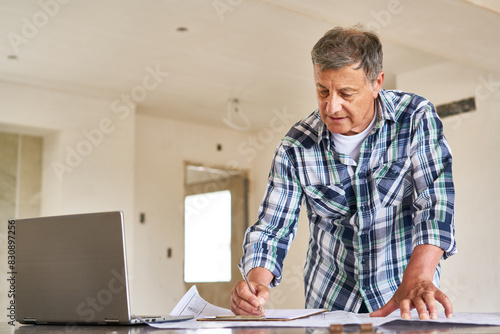 Senior male architect writing on clipboard over blueprint by laptop at desk in incomplete house