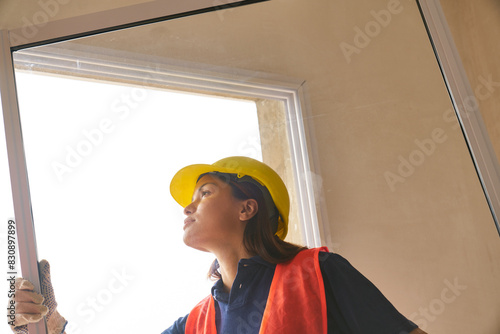 Young female construction worker wearing safety hardhat installing window frame at incomplete house