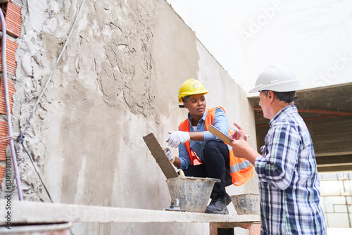 Senior male builder gesturing while talking to female bricklayer plastering wall with mortar at construction site