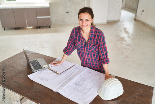 Young female architect analyzing blueprint by laptop at desk in incomplete house