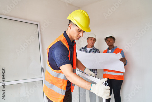 Young male carpenters wearing safety workwear installing window frame at incomplete house
