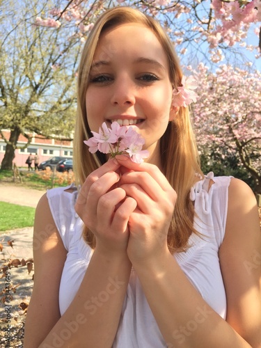 Junge Frau mit duftenden Kirschblüten