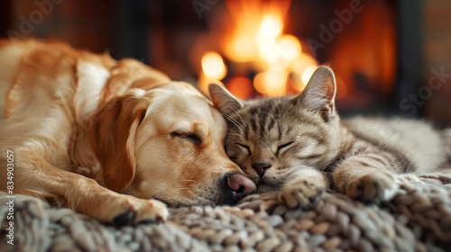 Golden retriever and tabby cat sleeping together by a cozy fireplace