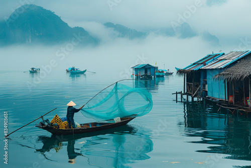 Fisherman casting net in calm waters with misty mountains in Vietnam