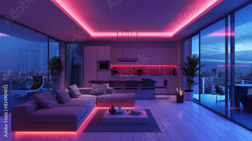 Futuristic smart home interior with voice-controlled lighting and panoramic city view