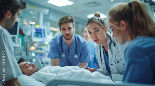 Medical team collaborating around a patient’s bed in a busy hospital ward