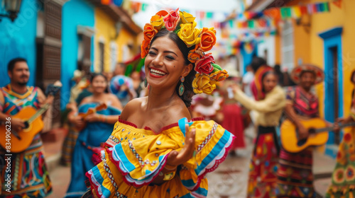 Joyful street performance with traditional dancers and musicians in colorful attire