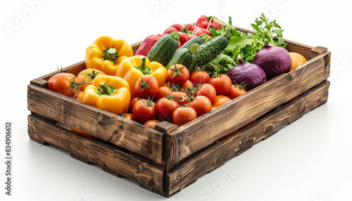 Fresh colorful vegetables in a wooden crate isolated on white background