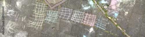 Rain falling in slow motion into puddles on sidewalk before row of bushes on a spring day