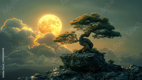 Chinese pine tree bonsai on rocky cliff at sunset with glowing clouds and full moon
