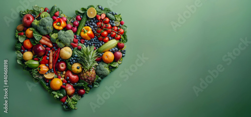 Heart shape made from various fresh fruits and vegetables on a vibrant yellow background symbolizing health and nutrition
