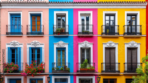 Colorful apartment building façade with balcony in Italian style