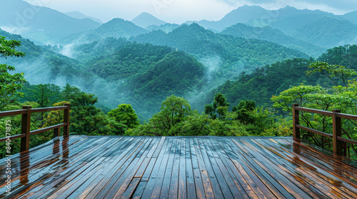 Magnificent view of wooden terrace and misty forest mountains in the morning