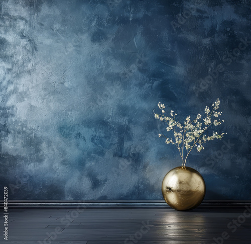 Minimalist navy blue wall with decorative golden sphere and white flowers