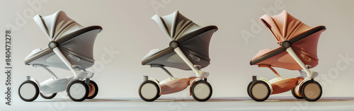 Modern baby stroller design concepts featuring three colorful models on a white background