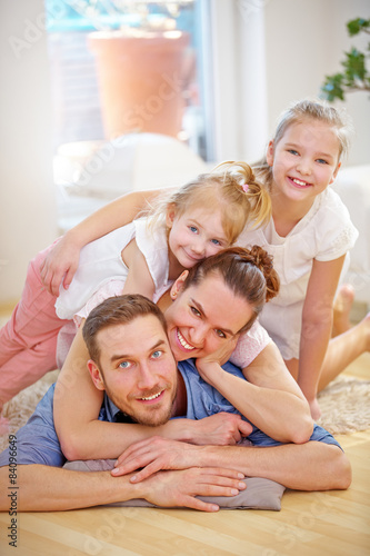 Glückliche Familie mit zwei Töchtern im Haus