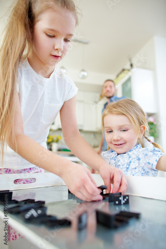Zwei Kinder bauen Strecke aus Dominosteinen