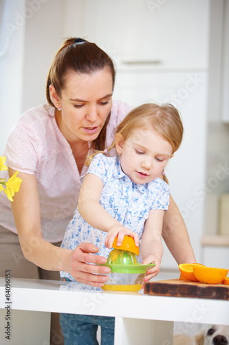 Kinder mit Entsafter und Orangen machen Orangensaft