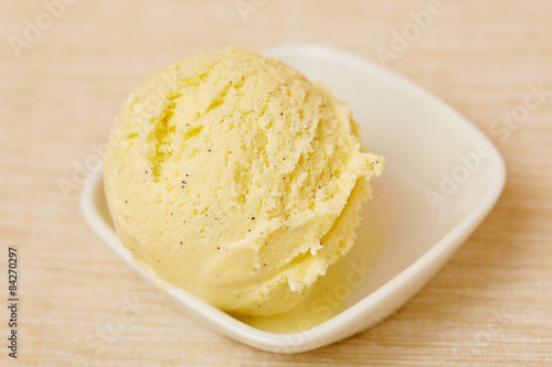 Eisbecher mit Pflaumeneis und Schokoladensauce