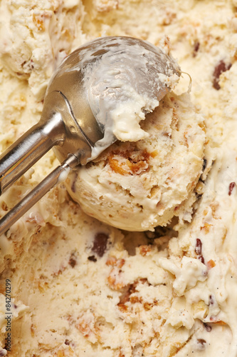 Eisportionierer formt Eiskugel von Vanilleeis mit Variegato