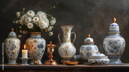 Elegant still life composition with porcelain vases and blooming white flowers