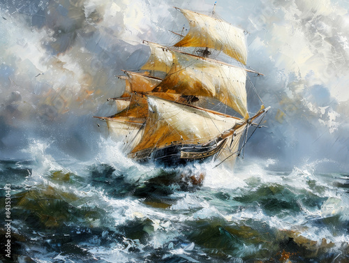 Hyperrealistic painting of a classic sailing ship navigating rough seas