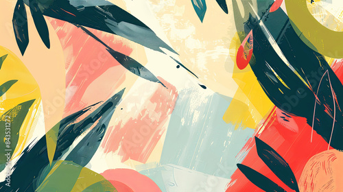 Abstract contemporary art collage with vibrant geometric shapes and colors creating a dynamic and visually stimulating composition on a clean white background.