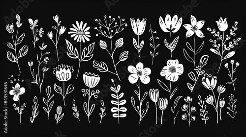 Botanical doodle background art vector set featuring various flower illustrations