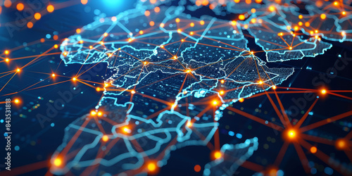Abstract digital map of Western Europe with glowing nodes and connections