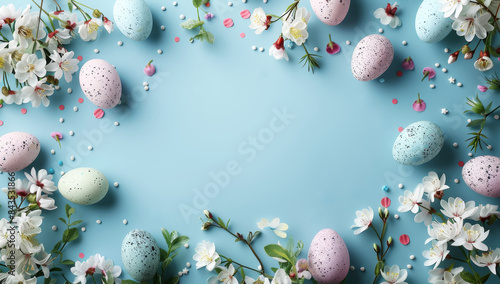 Elegant Easter frame with pastel colored eggs and blooming flowers on a soft blue background