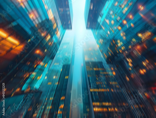 Modern skyscrapers with reflective glass facades against a vibrant evening sky