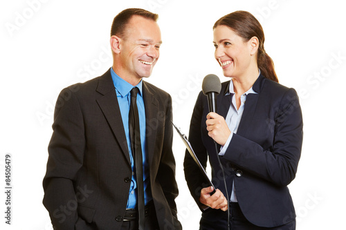Journalistin mit Mikrofon und Klemmbrett macht Umfrage