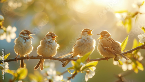 Five sparrows perched on a sunny branch in spring, backlit by golden sunlight