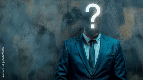 Anonymous businessman with a question mark instead of a face symbolizing mystery and uncertainty