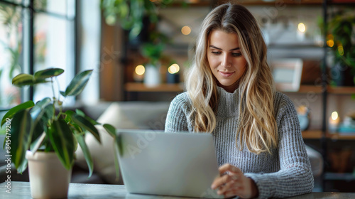 Young woman working on laptop in cozy home with warm lights and plants