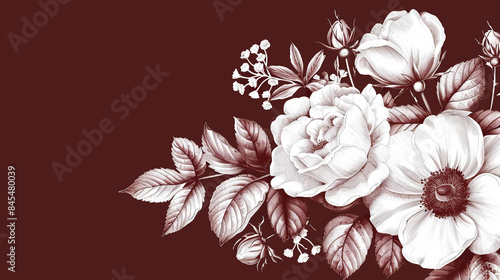 Elegant floral background with white flowers and leaves on a deep burgundy backdrop
