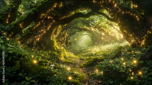 Enchanted forest scene with sparkling lights on moss-covered trees