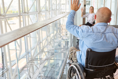 Man in wheelchair greeting a woman in a modern glass building