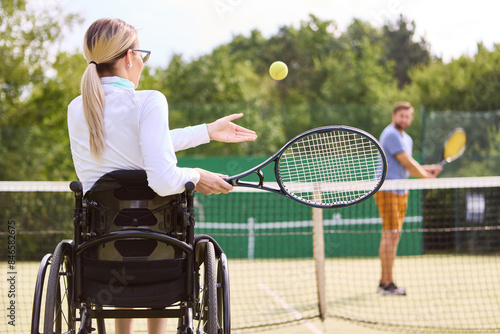 Woman in wheelchair playing tennis with partner on outdoor court