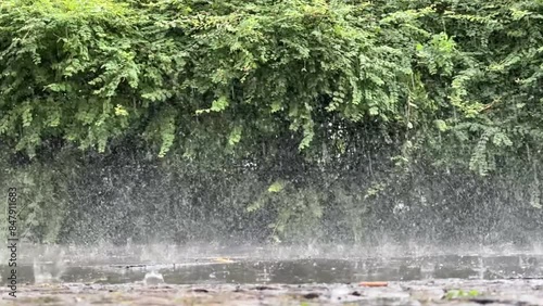 Heavy rain falling in puddles on sidewalk before row of bushes