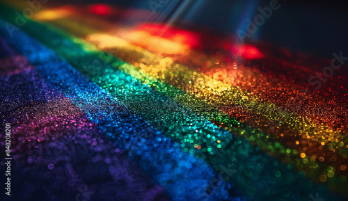 Closeup of the rainbow's edge with glitter on a black background