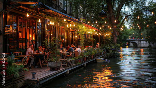 Romantic evening at a riverside outdoor restaurant with vibrant lighting