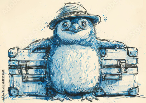 Anthropomorphic penguin with luggage line drawing showcasing travel concept