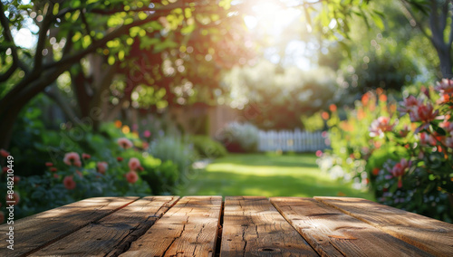 Rustic wooden table with vibrant floral garden backdrop in bright sunlight
